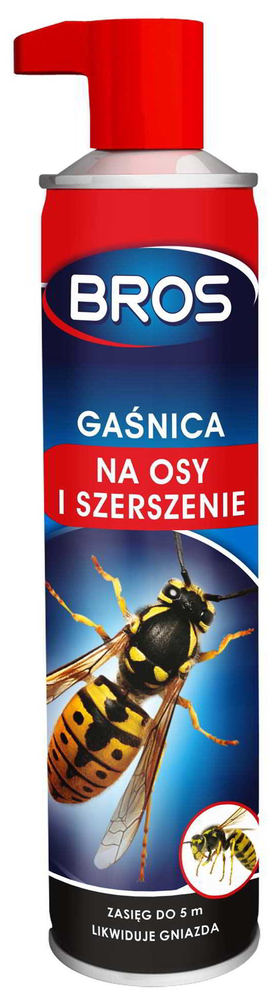 Gaśnica Bros to aerozol do zwalczania os. Unikalna konstrukcja zaworu umożliwia oprysk z odległości 5 m zapewniając bezpieczeństwo.