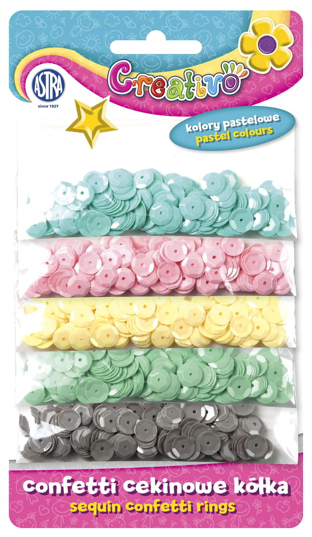 Wspaniale sprawdzają sie przy tworzeniu prac plastycznych, ozdób świątecznych i scarpbookingu. Confetti znajduje się w ergonomicznym pojemniku ułatwiającym wysypywanie. Kolory jakie znajdują się w opakowaniu to: żółty, różowy, zielony, popielaty, niebieski.