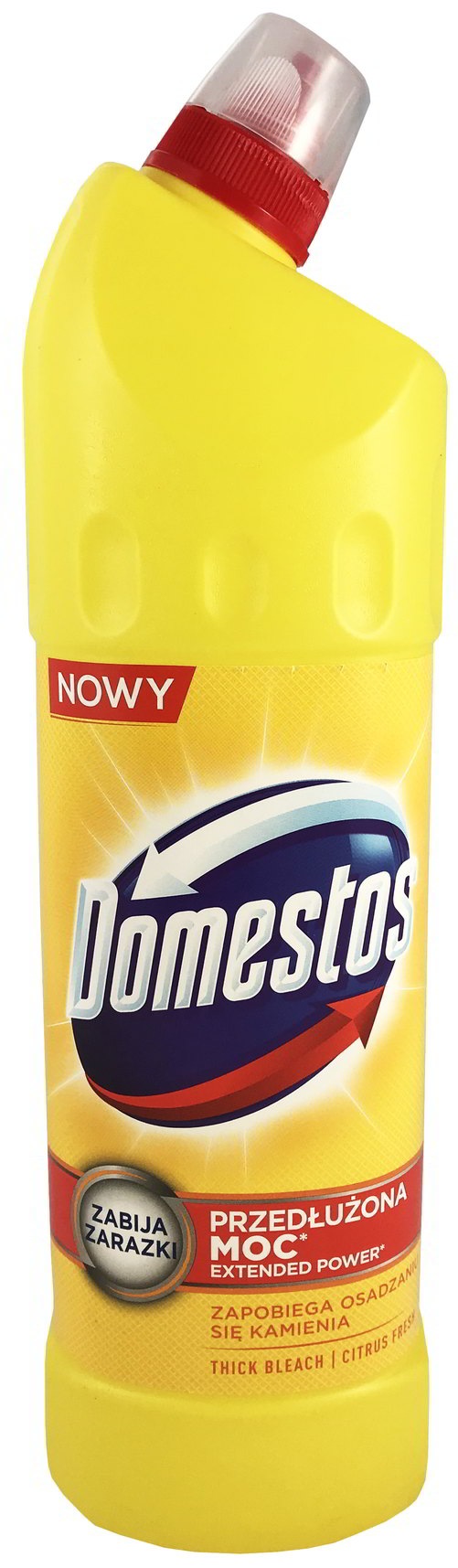 Domestos Citrus Fresh 1250 ml to zagęszczony płyn czyszcząco-dezynfekujący do toalet o świeżym, cytrynowym zapachu. Aktywne cząsteczki z wybielaczem chlorowym przylegają do powierzchni muszli, skutecznie usuwają kamień, plamy i zabrudzenia organiczne oraz zabijają 99,9% zarazków, pozostawiając wnętrze toalety higienicznie czyste i jaśniejsze. Regularne stosowanie pomaga zapobiegać ponownemu osadzaniu się kamienia, a zapach Citrus Fresh długo odświeża łazienkę. Duża pojemność 1250 ml jest ekonomicznym wyborem do domów, szkół, biur i innych obiektów o większym natężeniu użytkowania toalet.
