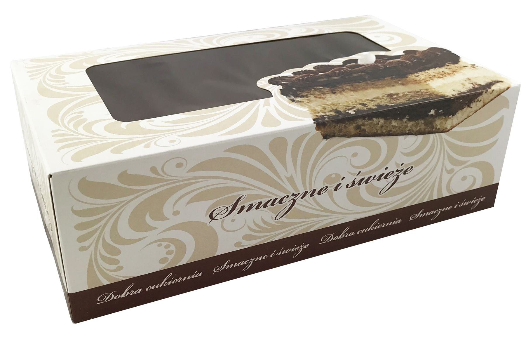 Jednoczęściowe pudełko cukiernicze do pakowania ciast. Całe pudełko jest oplecione estetycznymi ornamentami i uniwersalnym napisaem "smaczne i świeże". W dolnym rogu znalazło się również miejsce na apetyczny torcik.