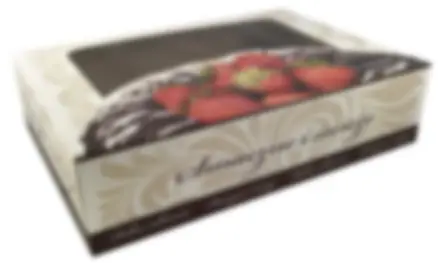 Jednoczęściowe pudełko cukiernicze do pakowania ciast. Całe pudełko jest oplecione estetycznymi ornamentami i uniwersalnym napisem "smaczne i świeże". W dolnym rogu znalazło się również miejsce na apetyczny torcik.