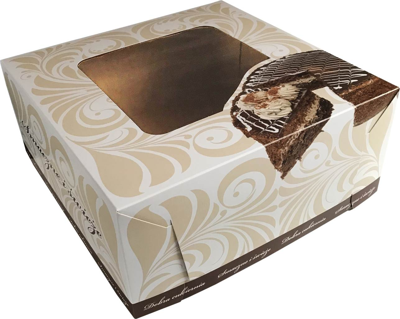Dwuczęściowe pudełko cukiernicze do pakowania ciast. Całe pudełko jest oplecione estetycznymi ornamentami i uniwersalnym napisem " smaczne i świeże". W dolnym rogu znalazło się również miejsce na apetyczny torcik.
