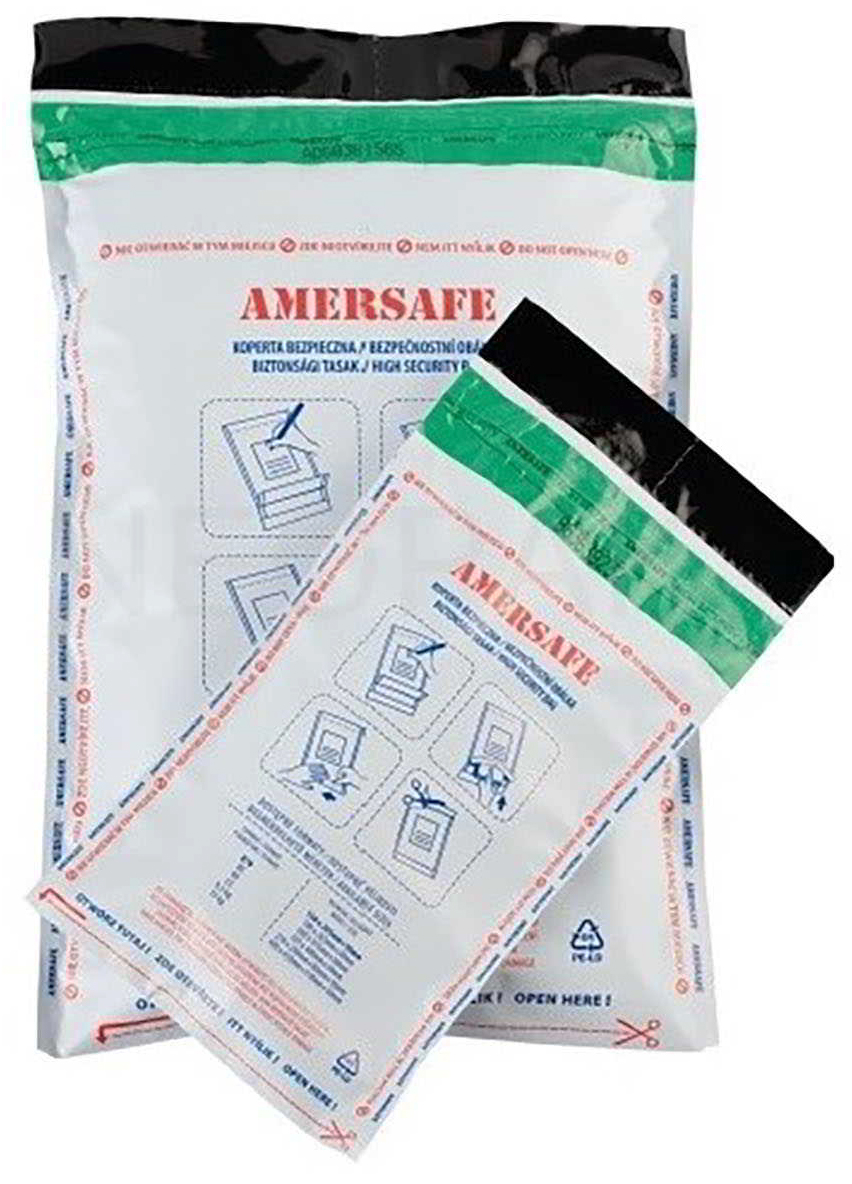 Samoklejące z paskiem Amersafe. Koperty z folii PP służą do przechwowywania oraz transportu poufnych i tajnych dokumentów, pieniędzy, biżuterii. Zabezpieczenia kopert posiadają certyfikaty bezpieczeństwa.