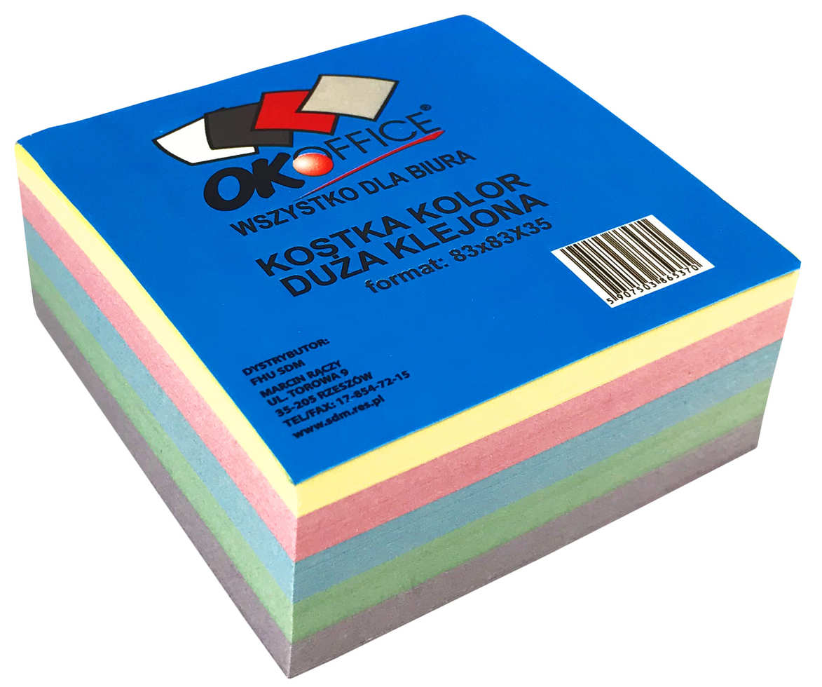 Kostka biurowa zawiera klejone, kolorowe karteczki, wymiary: (83x83x35mm). Możliwość wykorzystania jako samodzielny bloczek lub uzupełnienie pojemnika.