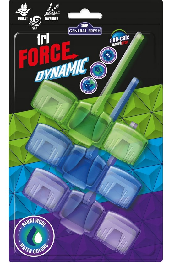Zawieszki do WC barwiące wodę Tri Force Dynamic zadbają z potrójną siłą o nieskazitelną czystość w toalecie. Dzięki eliminującej kamień technologii anti-calc oraz aktywnej pianie, usuwają zanieczyszczenia, gromadzące się w muszli klozetowej oraz sprawiają, że poczują Państwo świeżość lasu, rześkość morza lub świeżość limonki, zależnie od wybranego wariantu.