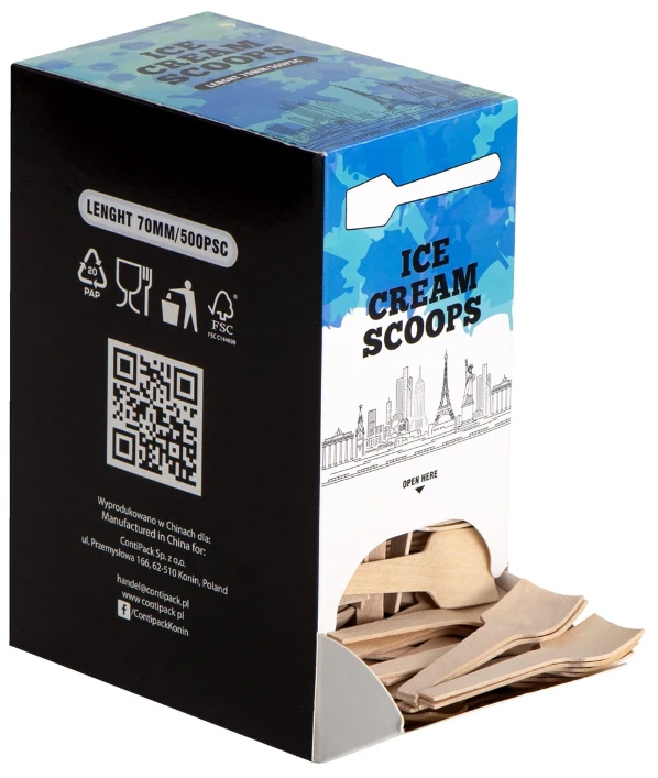 Drewniane łopatki do lodów, wykonane z lekkiego drewna, niebielone. Są biodegradowalne, nadają się do kompostowania. Łyżeczka - łopatka jest bezpieczna w użyciu: wygładzona, bez nierówności i zadrapań.