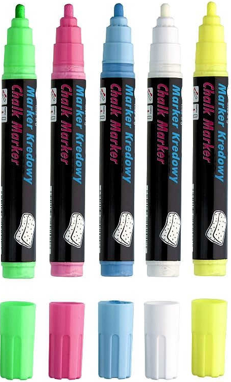 Marker z płynną kredą do pisania po tablicach, zmywalny wodą jak zwykła kreda. Opakowanie zawiera 5 szt, (mix kolor).