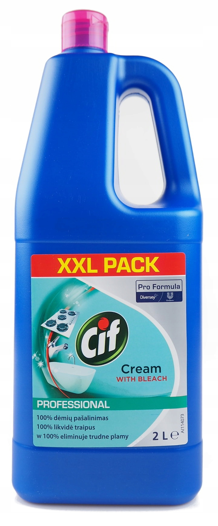 Mleczko CIF 2L z wybielaczem Cream with Bleach to profesjonalny środek do doczyszczania mocno zabrudzonych, twardych, wodoodpornych powierzchni. Połączenie wybielacza i mikrodrobinek czyszczących skutecznie usuwa tłuszcz, osady kamienia, rdzy, plamy z pleśni oraz przypalone resztki jedzenia, przywracając powierzchniom jasny, czysty wygląd. Produkt polecany jest do powierzchni emaliowanych, płytek ceramicznych, plastiku, stali nierdzewnej i płyt vitroceramicznych; nie pozostawia smug i łatwo się spłukuje. Wydajna pojemność 2 l sprawdzi się w kuchniach, łazienkach oraz zapleczach gastronomicznych i obiektach profesjonalnych.