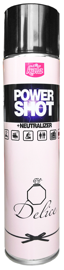 Neutralizator nieprzyjemnych zapachów, odświeżacz Kala POWER SHOT to produkt z rewolucyjnym sposobem dozowania, dzięki któremu jedno naciśnięcie wentyla (ok. 1 sekunda) neutralizuje nieprzyjemne zapachy oraz aromatyzuje około 200m3. W składzie odświeżacza obecne są substancje czynne, dzięki którym nieprzyjemne zapachy są neutralizowane a nie jak w przypadku większości odświeżaczy przykrywane. Wraz z neutralizacją nieprzyjemnych zapachów POWER SHOT zapewnia równieź aromatyzację przestrzeni.