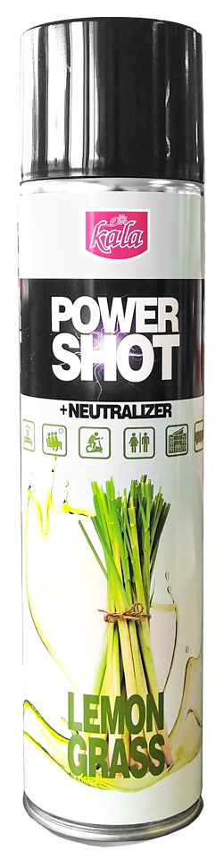 Neutralizator nieprzyjemnych zapachów, odświeżacz Kala POWER SHOT to produkt z rewolucyjnym sposobem dozowania, dzięki któremu jedno naciśnięcie wentyla (ok. 1 sekunda) neutralizuje nieprzyjemne zapachy oraz aromatyzuje około 200m3. W składzie odświeżacza obecne są substancje czynne, dzięki którym nieprzyjemne zapachy są neutralizowane a nie jak w przypadku większości odświeżaczy przykrywane. Wraz z neutralizacją nieprzyjemnych zapachów POWER SHOT zapewnia równieź aromatyzację przestrzeni.