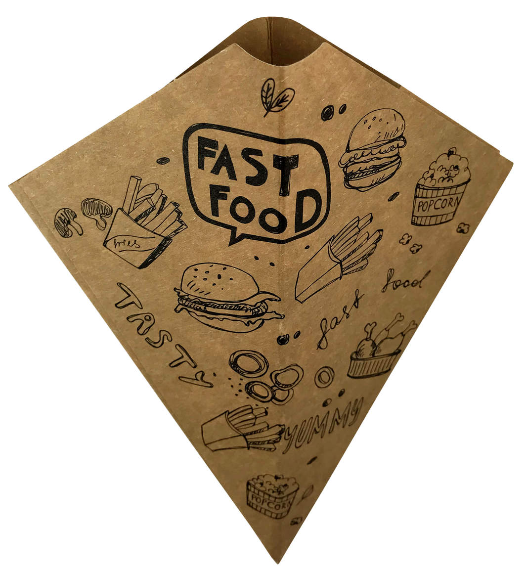 Nowoczesne i stabilne opakowanie na frytki z rozkładanym narożem do majonezu, keczupu i innych sosów. Wykonane z kartonikaw kolorze kraftowym na zewnatrz oraz kolorze białym wewnatrz, biodegradowalne, odporne na tłuszcz - nie nadaje sie do płynnej żywności. Wymiary: górna szerokość - 19cm, wysokość - 23,5 cm, pojemność - około 150gr. frytek. Opakowanie zawiera 50szt.