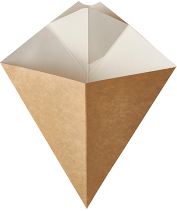 Nowoczesne i stabilne opakowanie na frytki z rozkładanym narożem do majonezu, keczupu i innych sosów. Wykonane z kartonikaw kolorze kraftowym na zewnatrz oraz kolorze białym wewnatrz, biodegradowalne, odporne na tłuszcz - nie nadaje sie do płynnej żywności. Wymiary: górna szerokość - 19cm, wysokość - 23,5 cm, pojemność - około 150gr. frytek. Opakowanie zawiera 50szt.