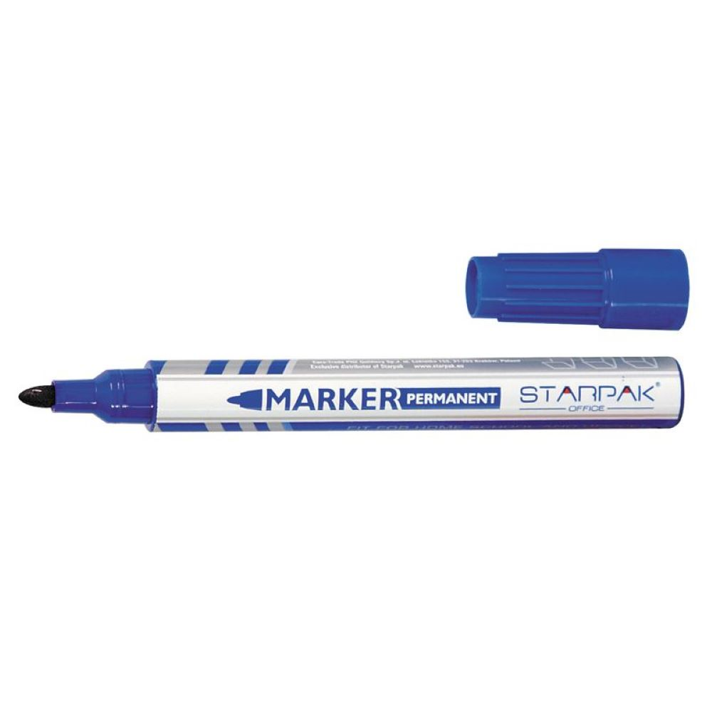 Niebieski permanentny marker, przydatny w każdym biurze, szkole czy domu. Utwardzona, okrągła końcówka. Opakowanie zbiorcze zawiera: 12 szt.