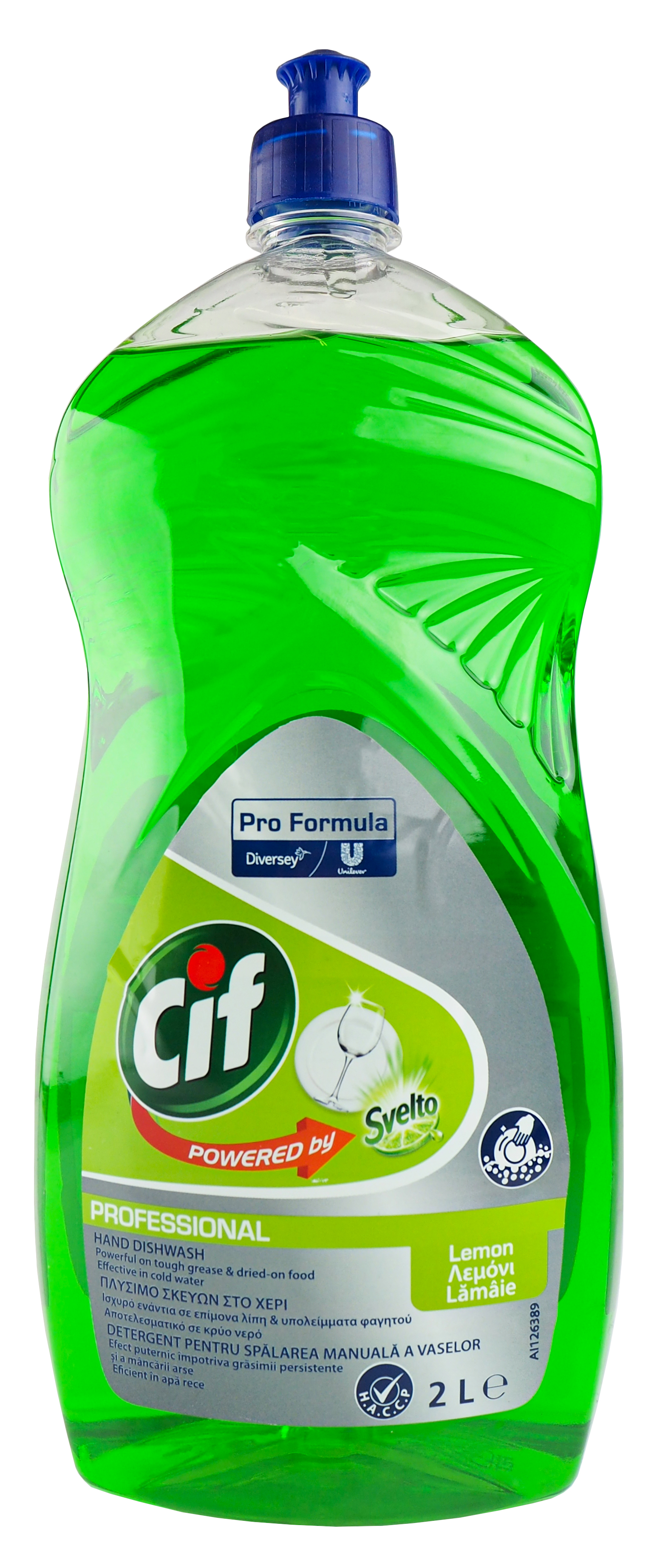 Płyn do naczyń Cif Professional Lemon 2L (Pro Formula / Hand Dishwash) to skoncentrowany detergent do ręcznego mycia naczyń. Skutecznie usuwa tłuszcz, przypalenia i zaschnięte resztki jedzenia, zapewniając błyszcząco czyste naczynia bez smug nawet w zimnej wodzie. Nadaje się do mycia szkła, porcelany, stali nierdzewnej, garnków, patelni oraz przyborów kuchennych, a pH neutralne dla skóry sprawia, że jest łagodny dla dłoni. Świeży cytrynowy zapach uprzyjemnia mycie, a pojemność 2 L jest praktyczna dla domów, biur, małej gastronomii i firm cateringowych.