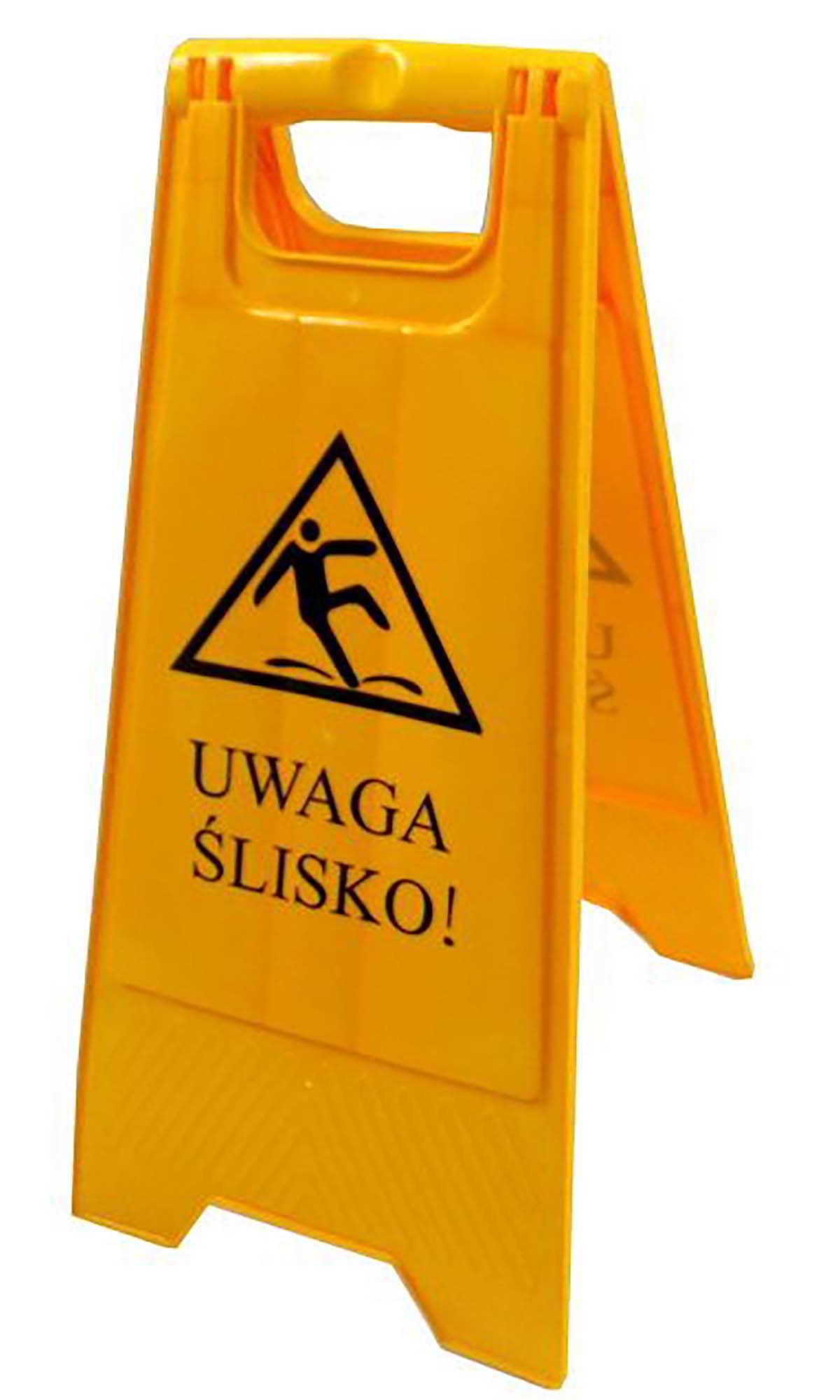 Żółty stojak, potykacz, "Uwaga ślisko". Środek zapobiegający przed przypadkowym poślizgnięciem. Produkt do wykorzystania podczas prac porządkowych powierzchni w obiektach użyteczności publicznej.