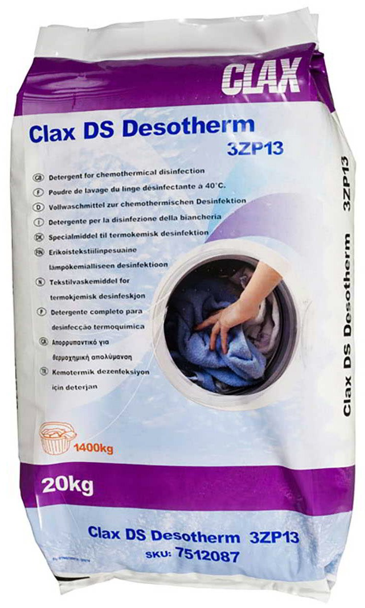 Proszek dezynfekujący Clax Desotherm, to preparat piorący, nie zawiera fosforanów, oparty na bazie związków powierzchniowo-czynnych. Jest odpowiedni do prania białych tkanin bawełnianych i bawełniano-poliestrowych oraz do prania tkanin pochodzących ze szpitali i innych placówek. Skuteczny w działaniu. Opakowanie: 20kg.