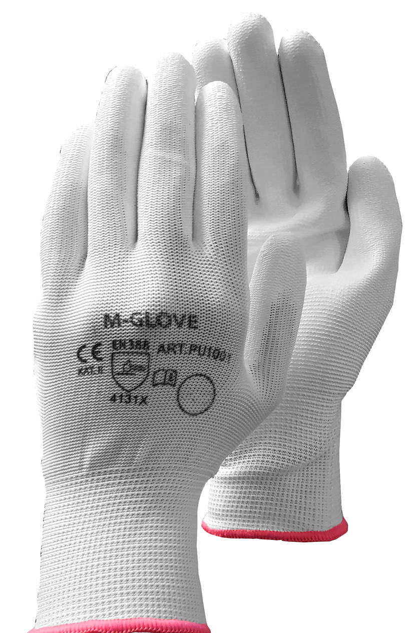 Rękawice ochronne wykonane z białe elastycznej dzianiny rylonowej, bez szwów, powlekane w części chwytnej białym poliuretanem, zakończone elastycznym ściągaczem.