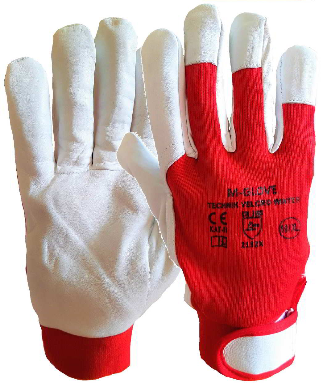 Rękawice ochronne ocieplane wykonane z elastycznej dzianiny wzmacniane skórą kozią, całodłonnicowe. Przy nadgarstku gumka ściągająca. Posiadają wzmocnione skórą końcówki palców i palec wskazujący. Idealne do prac w niskich temperaturach, stosowane w magazynach, chłodniach. Kolor: biało-czerwone.