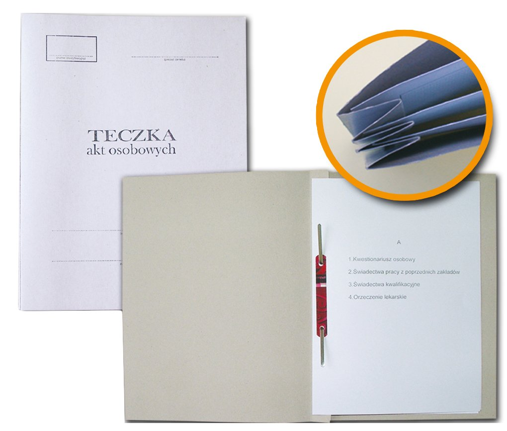 Skoroszyt akt osobowych papierowy, format: A4. Posiadają dwustronnie zadrukowane przekładki A,B,C,D o gramaturze 80g. Rozszerzany grzbiet o szerokości: 80mm. Plastikowy docisk dokumentów zabezpiecza przed skaleczeniem.