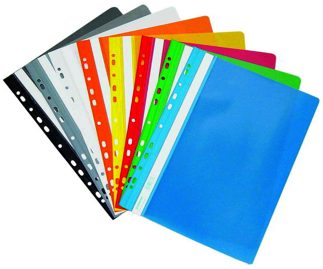 Skoroszyt wykonany z PCV, twardy. Przednia strona transparentna. Mieści ok 200 kartek, wymienny, dwustronnie zapisywany pasek brzegowy.