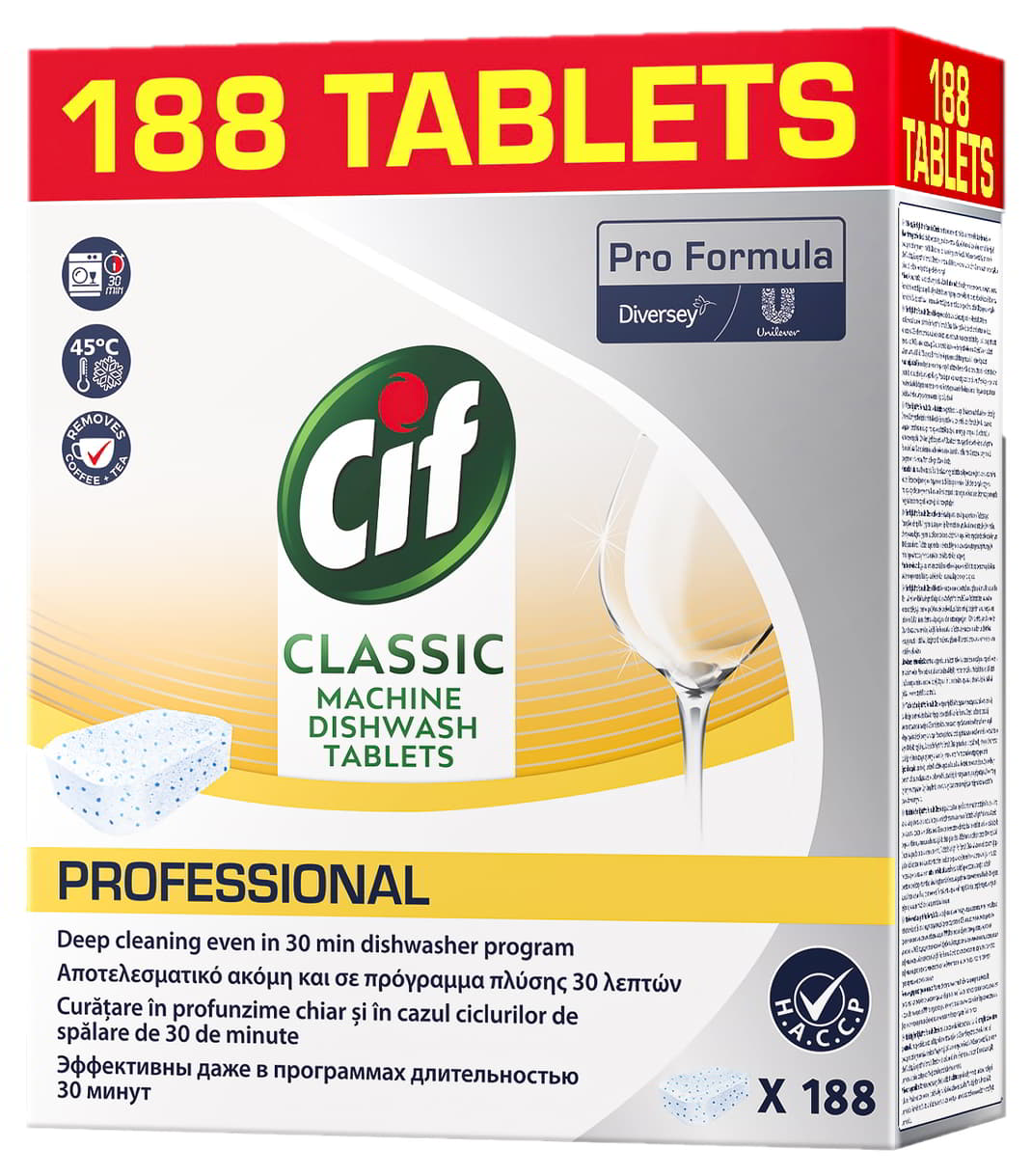 Tabletki do zmywarki CIF Classic 188 szt SUN to profesjonalne, klasyczne tabletki do maszynowego mycia naczyń, przeznaczone do zmywarek domowych i gastronomicznych. CIF Pro Formula Classic zapewnia dokładne czyszczenie naczyń i ochronę szkła, skutecznie usuwa tłuszcz oraz zabrudzenia po kawie i herbacie. Skoncentrowana formuła zużywa ok. 30% mniej chemii w porównaniu z typowymi tabletkami, a technologia Clean Boost pomaga oszczędzać wodę i energię, działając już w krótkich programach 30-minutowych w temperaturze 45°C. Duże opakowanie 188 sztuk jest idealne dla domów, biur, restauracji i firm cateringowych.