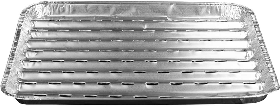 Zestaw trzech aluminiowych tacek do grilla. Nie zmieniają smaku potraw, rowki wentylacyjne zapewniają lepszą cyrkulację powietrza.