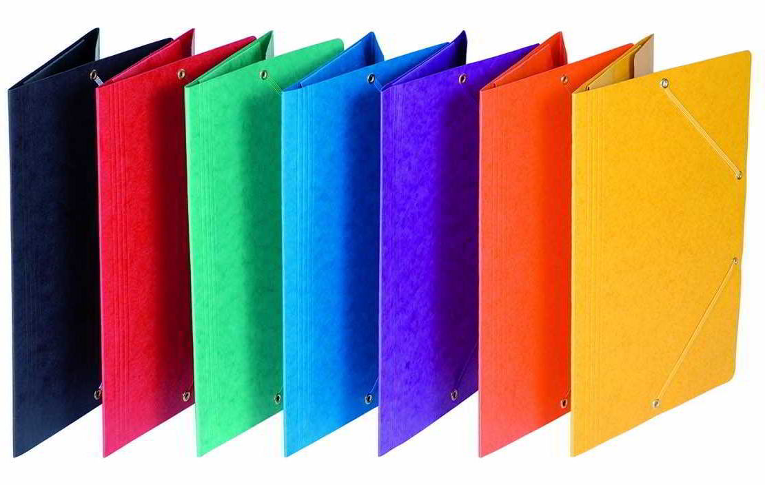 Teczka papierowa wykonana z preszpanu powlekanego woskiem, o gramaturze: 390g. 3 skrzydła wewnętrzne zamykane gumką chroniącą zawartość przed wysunięciem, płaskie narożne gumki dociskające w kolorze teczki. Wymiary: 235x 319mm.