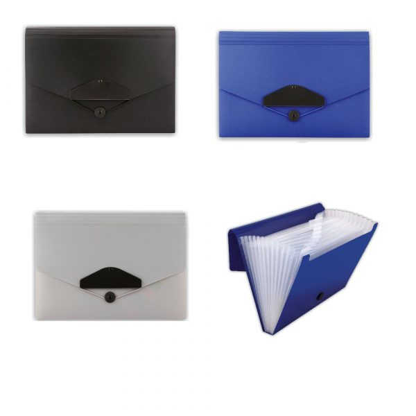 Aktówka z dwunastoma przegródkami, wykonana z mocnego polipropylenu o grubości 0,6mm. Zamykana na gumkę, dostosowana do dokumentów formatu A4.