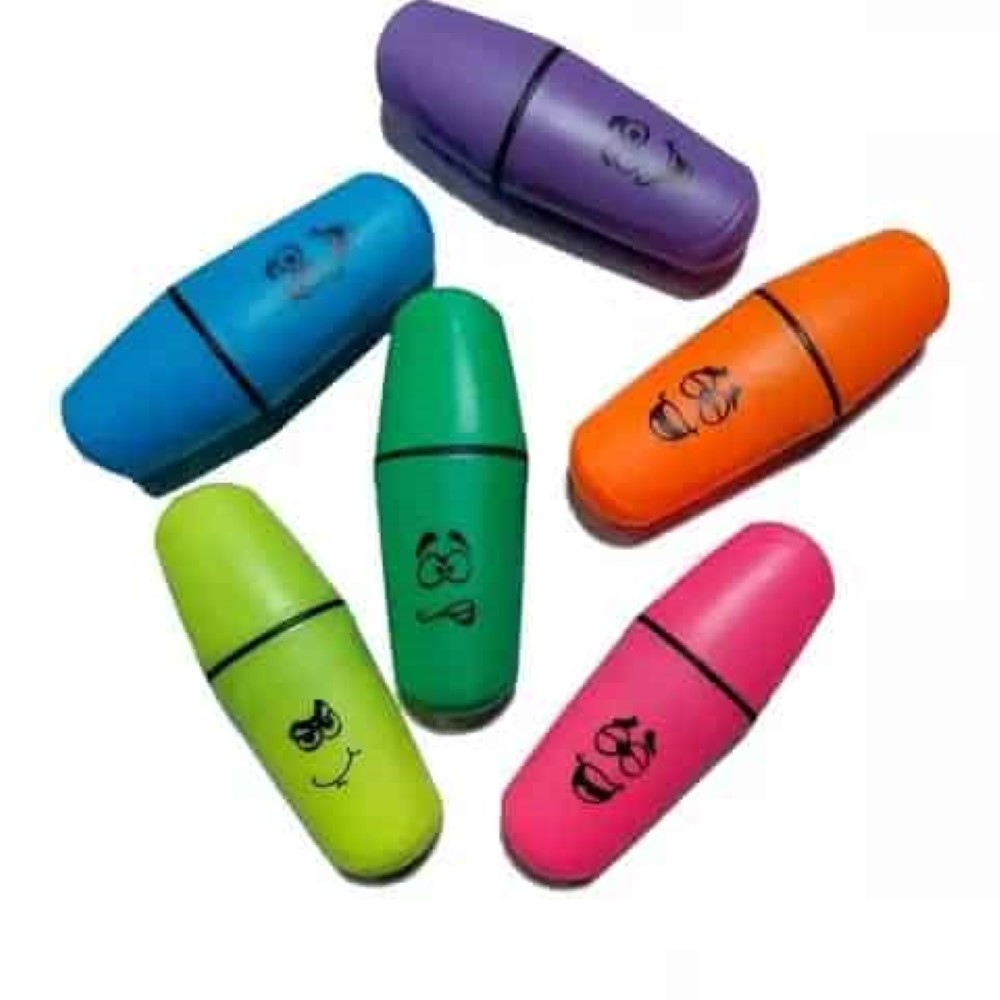 Mini zakreślacz z wesołymi minkami o intensywnych barwach. Tusz nietoksyczny o wysokiej wydajności i trwałości, odporny na działanie światła. Wielkość zakreślacza: 7x2,5cm.