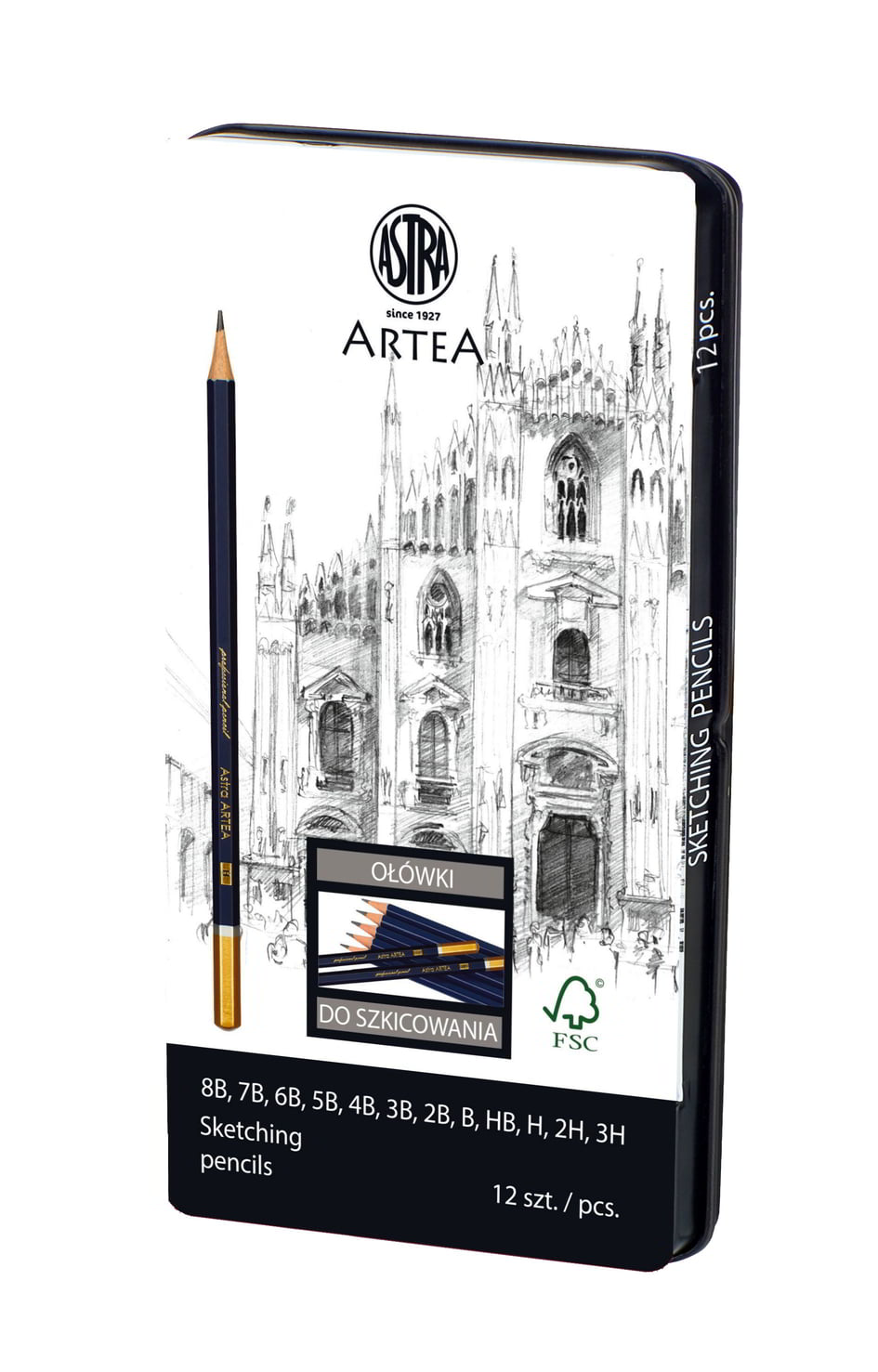 Zestaw ołówków przeznaczony jest do kreślenia, szkicowania i rysowania. Opakowanie zawiera twardość: 3B, 2B, B, HB, H, 2H. Ołówki znajdują się w metalowym pudełku idealnym na prezent.